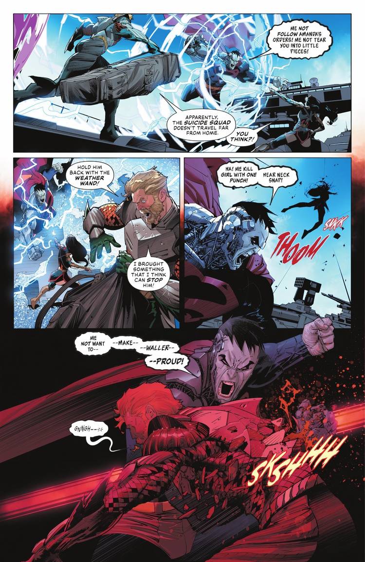 Mientras las fuerzas de Amanda Waller continúan despojando y arrestando a superhéroes de todo el mundo durante Poder absoluto #3 del escritor Mark Waid y el artista Dan Mora, los héroes tuvieron que ser creativos para mantenerse a la vanguardia de los esfuerzos de Waller por librar al mundo de los metahumanos. Cuando un Aquaman sin poderes se enfrenta a un Bizarro enfurecido, parece que Aquaman no tiene ninguna posibilidad, hasta que saca su arma secreta: la Misericordia Negra.