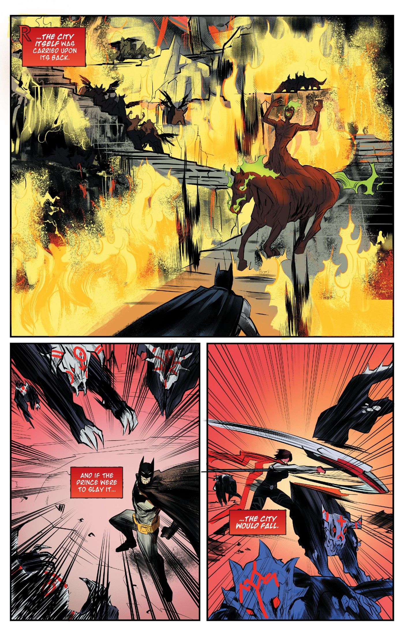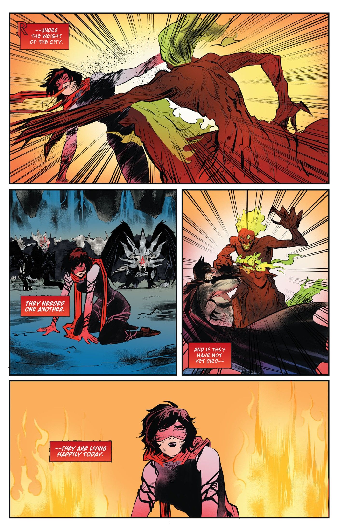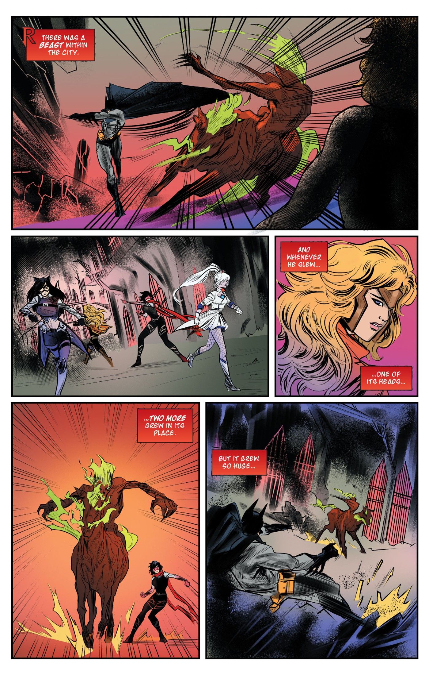 Vista previa de paneles para DC/RWBY #7, el último número del crossover, presenta una narración que describe la enemistad entre Batman y el Joker en términos mitológicos. Batman es el príncipe que protege la ciudad de Gotham, mientras que su adversario el Joker es la bestia que aterroriza la ciudad. Por mucho que el príncipe huérfano quiera “matar” la bestia, Gotham caerá si lo hace, en alusión a las repercusiones de que Batman rompa su regla de no matar al Joker. Sin embargo, continúa la narración, si llegó un día en que el golpe se comió al príncipe, entonces la bestia “dejaría de crecer – y se marchitaría – y se desmoronaría.” Lo más intrigante son los comentarios finales: “Se necesitaban unos a otros. Y si aún no han muerto, hoy viven felices”.