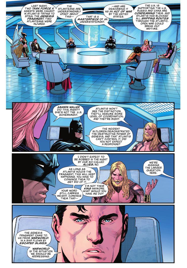En Acción Comics # 1033 por Phillip Kennedy Johnson, Daniel Sampere y Adriano Lucas, Superman muestra que su interés radica en Warworld, mientras que Batman está más interesado en evitar que Estados Unidos y Atlantis vayan a la guerra. En este número, el Hombre de Acero reúne a la Liga de la Justicia con el interés de reunirlos a todos para dirigirse a Warworld. Sin embargo, las cosas cambian cuando Batman muestra la importancia de evitar que suceda la nueva guerra con destino a la Tierra. Extrañamente, Aquaman parece estar más que bien con que las dos naciones vayan a la guerra. Sin embargo, Superman está enfurecido por la falta de perspectiva de la Liga de la Justicia, cuando le queda claro que Mongul es donde deben centrarse.