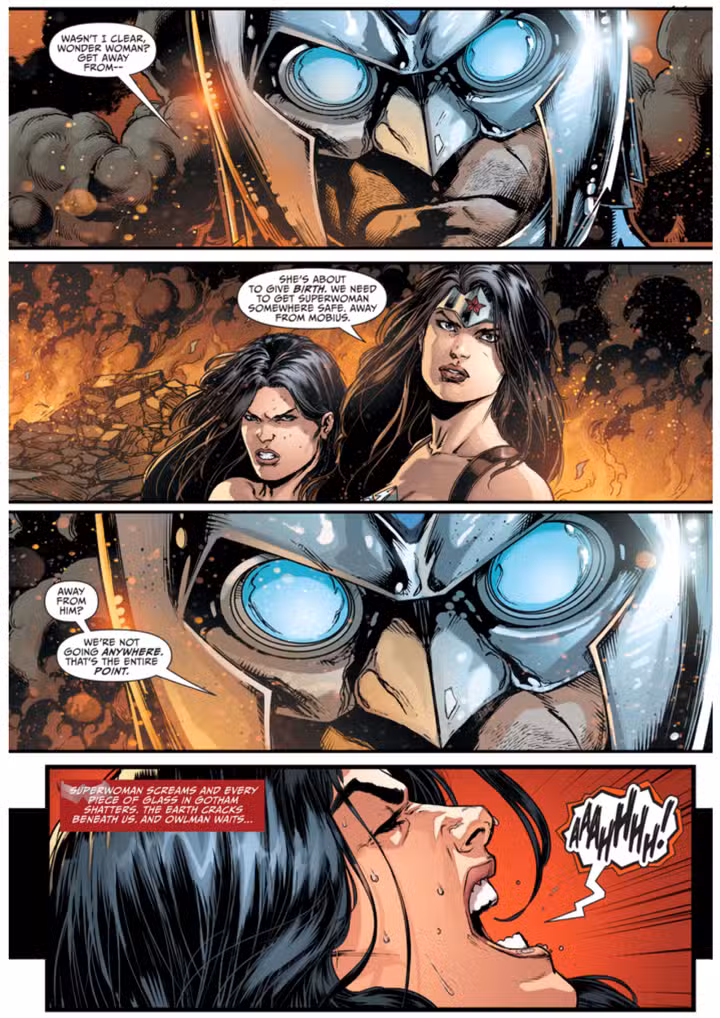Justo antes de que Superman esté a punto de golpearla, ella dice: “¿Qué clase de caballero blanco serías si golpearas a una mujer embarazada?” Esto inmediatamente detiene a Clark en seco y le da a Ultraman, quien se revela como el padre del niño, la oportunidad de atacar a Superman. Finalmente, Bruce y Clark logran escapar de regreso a su Tierra, dejando a los fanáticos digerir la impactante revelación de que Superwoman ahora está embarazada de un bebé villano.