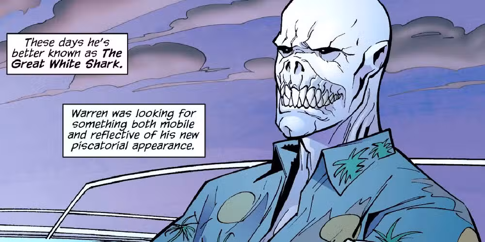 La medida resultó ser un error, ya que Warren fue brutalizado por los residentes de Arkham, quienes sintieron que era un pretendiente y lo despreciaron por la naturaleza depredadora de sus crímenes, con Joker llamándolo “La peor persona que he conocido”. Con los labios y la nariz congelados en la celda de Mister Freeze y falsas ‘branquias’ cortadas en su cuello, White perdió la cabeza y aceptó la identidad del Gran Tiburón Blanco.