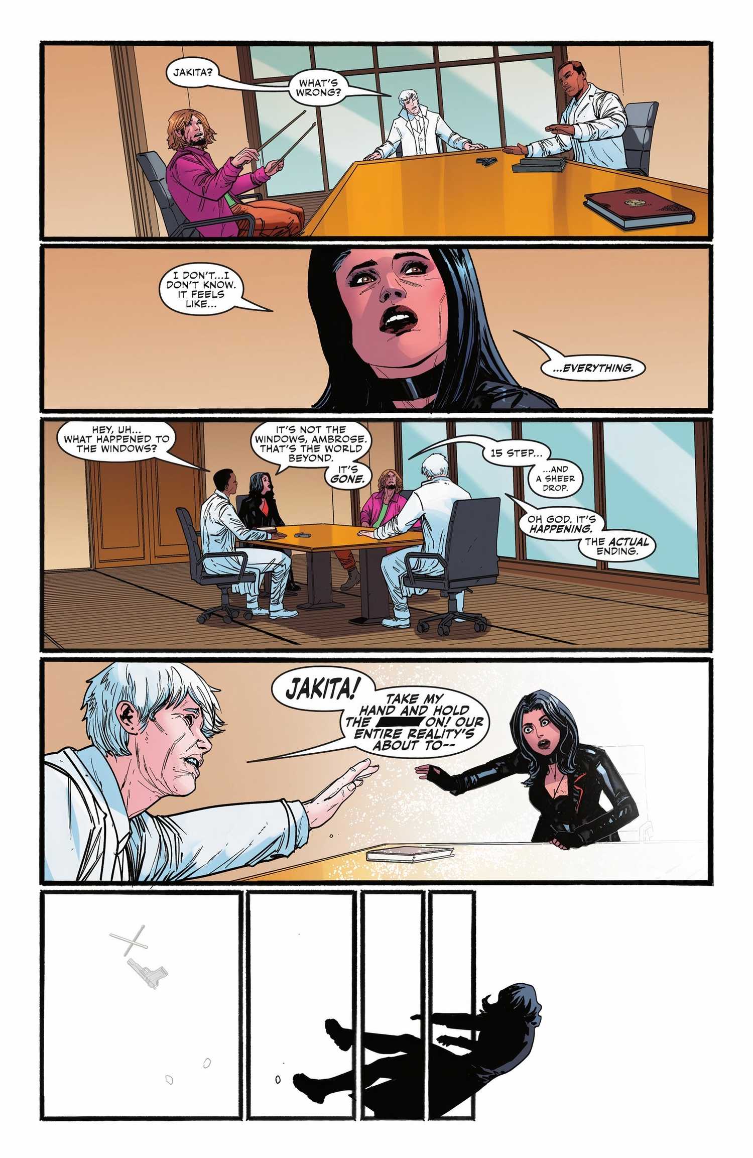 Forasteros El número 7 está escrito por Jackson Lanzing y Collin Kelly y dibujado por Robert Carey. El número comienza con Jakita Wagner asistiendo a una reunión de la junta directiva de Planetary cuando el mundo exterior se vuelve blanco. Jakita es arrojada a la blancura, donde tiene una visión de Flash.