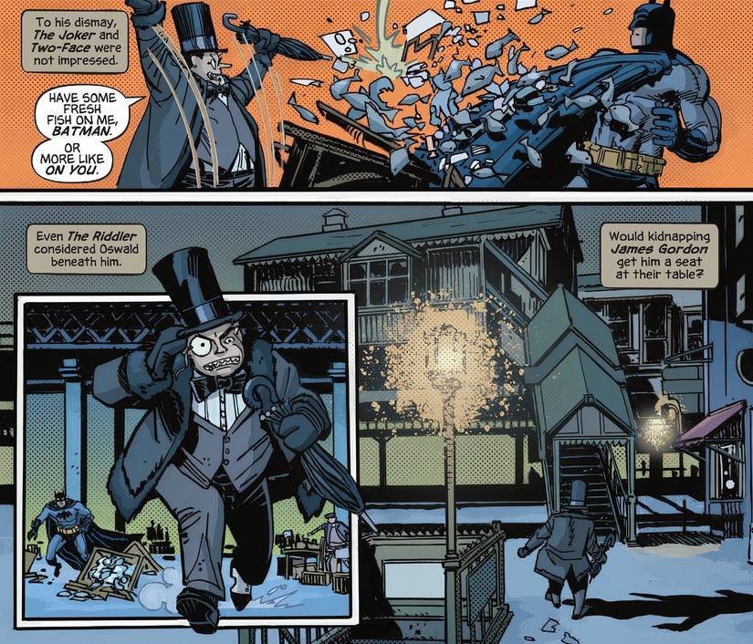 En Batman: El largo Halloween – El último Halloween #2 de Jeph Loeb, Klaus Janson, Dave Stewart y Richard Starkings, Batman continúa su investigación sobre la desaparición de James Gordon Jr. Cuando una pista lo lleva al Pingüino, rastrea al criminal con la esperanza de obtener respuestas sobre el hijo del comisionado Gordon. Batman se enfrenta al Pingüino y comparte una verdad impactante sobre su papel en Gotham City: “Incluso entre sus supuestos compañeros, El Pingüino nunca se ganó el respeto que ansiaba”.