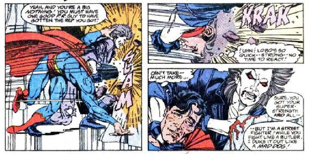 El último miembro de la especie zarniana, Lobo es un cazador de recompensas intergaláctico y una de las pocas personas en el universo que Superman odia genuinamente. Los dos se han enfrentado varias veces, con Lobo que muestra una fuerza asombrosa que le permite destruir un planeta entero con un solo golpe. Con una larga historia de hacer sangrar a Superman, el veneno de Bane hace que Lobo sea aún más fuerte de lo que ha estado despierto hasta ahora.