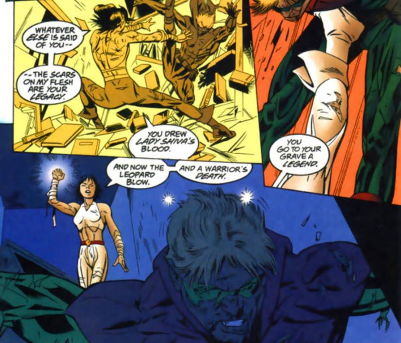 Cuando Connor Hawke y Lady Shiva pelearon, años antes de que Batgirl la derrotara, fue lo más cerca que cualquiera llegó a ser igualado con Lady Shiva y lo más cerca que cualquiera había llegado a golpearla. Connor sacó sangre y rompió huesos, y para recordar, Shiva no puede recordar la última vez que alguien le hizo eso. El enfrentamiento fue la pelea de cualquiera, hasta que Shiva entregó el golpe de leopardo, el factor decisivo. Connor no obtuvo la victoria, pero ganó el respeto de Shiva. También gana el respeto de Batman, quien lo llama el luchador número dos del número uno de Shiva.
