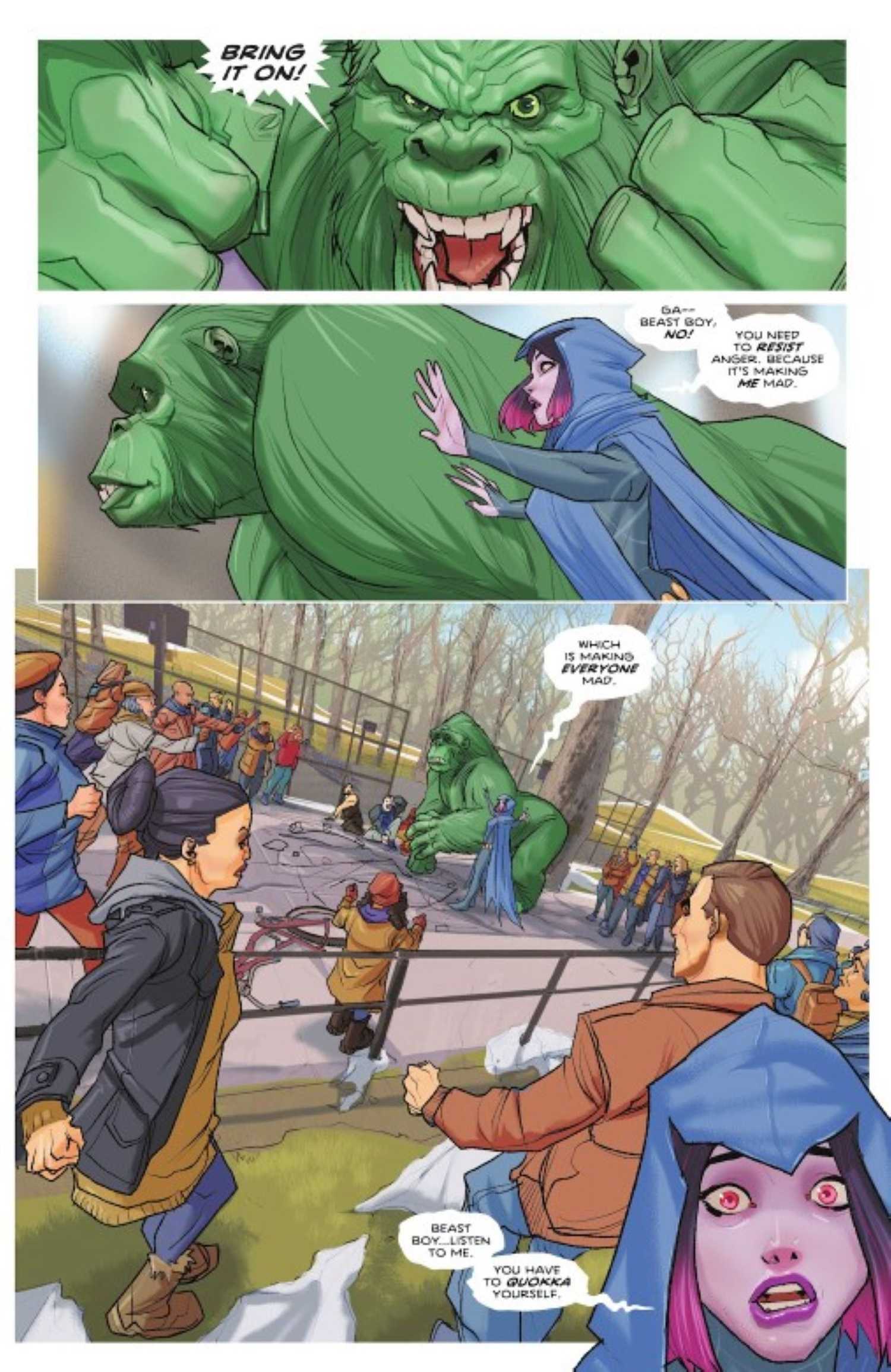 Su conversación se interrumpe cuando un baloncesto callejero golpea a Raven en la cabeza, provocando una confrontación entre Beast Boy y los hombres que juegan cerca. A medida que se elevan las tensiones, Beast Boy “Hulks fuera” transformándose en un gorila verde masivo y furioso. En respuesta, Raven ofrece una línea que parece ser un guiño inteligente al icónico de Hulk “Siempre estoy enojado” cita de Los vengadores (2012).
