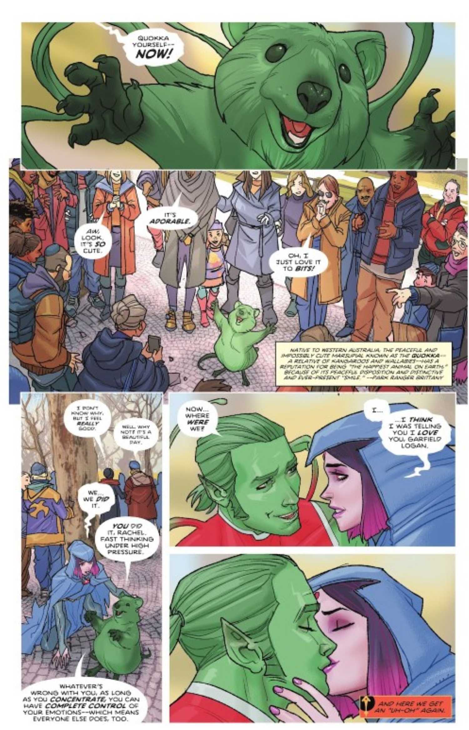 A medida que Beast Boy y el grupo de hombres se vuelven más enojados, las habilidades empáticas inestables de Raven comienzan a amplificar sus emociones, difundiendo involuntariamente esa ira a todos los que los rodean, incluidos los transeúntes. Al darse cuenta de que necesita calmar a Beast Boy antes de que la situación se convierta en violencia, Raven grita, “Tienes que quokka a ti mismo”. Al principio, el significado no está claro, pero luego Beast Boy cambia a un marsupial adorable, con forma de marmota, conocido como el animal más feliz de la tierra. La transformación desactiva inmediatamente la tensión, desescalando el conflicto.