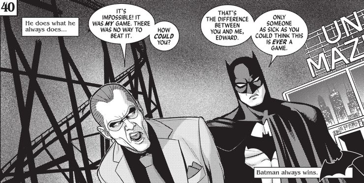 En lugar de seguir las reglas establecidas en la historia, los lectores deben pasar a ciertos paneles a los que no se puede acceder siguiendo ninguna de las otras opciones. Cada vez que se hace esto, el Acertijo parece sorprendido, sin comprender cómo el Caballero Oscuro podría superar sus trampas mortales. Eventualmente, jugar con sus propias reglas en lugar de las de Riddler le permite a Batman detener a ambos enemigos y salir ileso. En el panel final, Riddler incluso despotrica sobre cómo se suponía que su juego era imbatible. Esto lleva a Batman a comentar sobre cómo la única forma en que podía ganar era no aceptar la premisa de Riddler de que estaban jugando un juego.