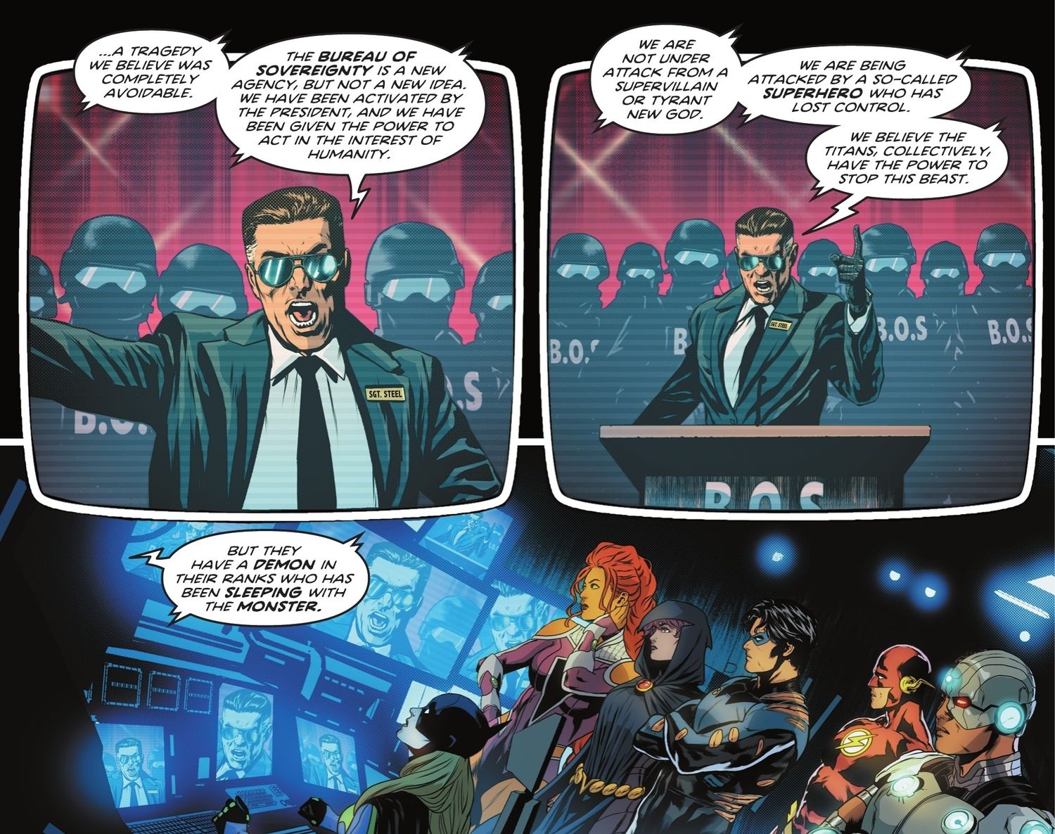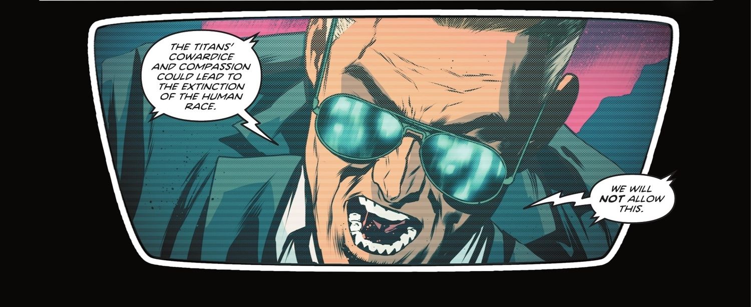 “/> A pesar de que los Titanes han tomado la iniciativa en la crisis, la mayoría del mundo no está contenta con su respuesta hasta el momento. Esto incluye a Sargent Steel, quien acude a la televisión nacional para declarar: “La cobardía y la compasión de los Titanes podrían llevar a la extinción de la raza humana“.