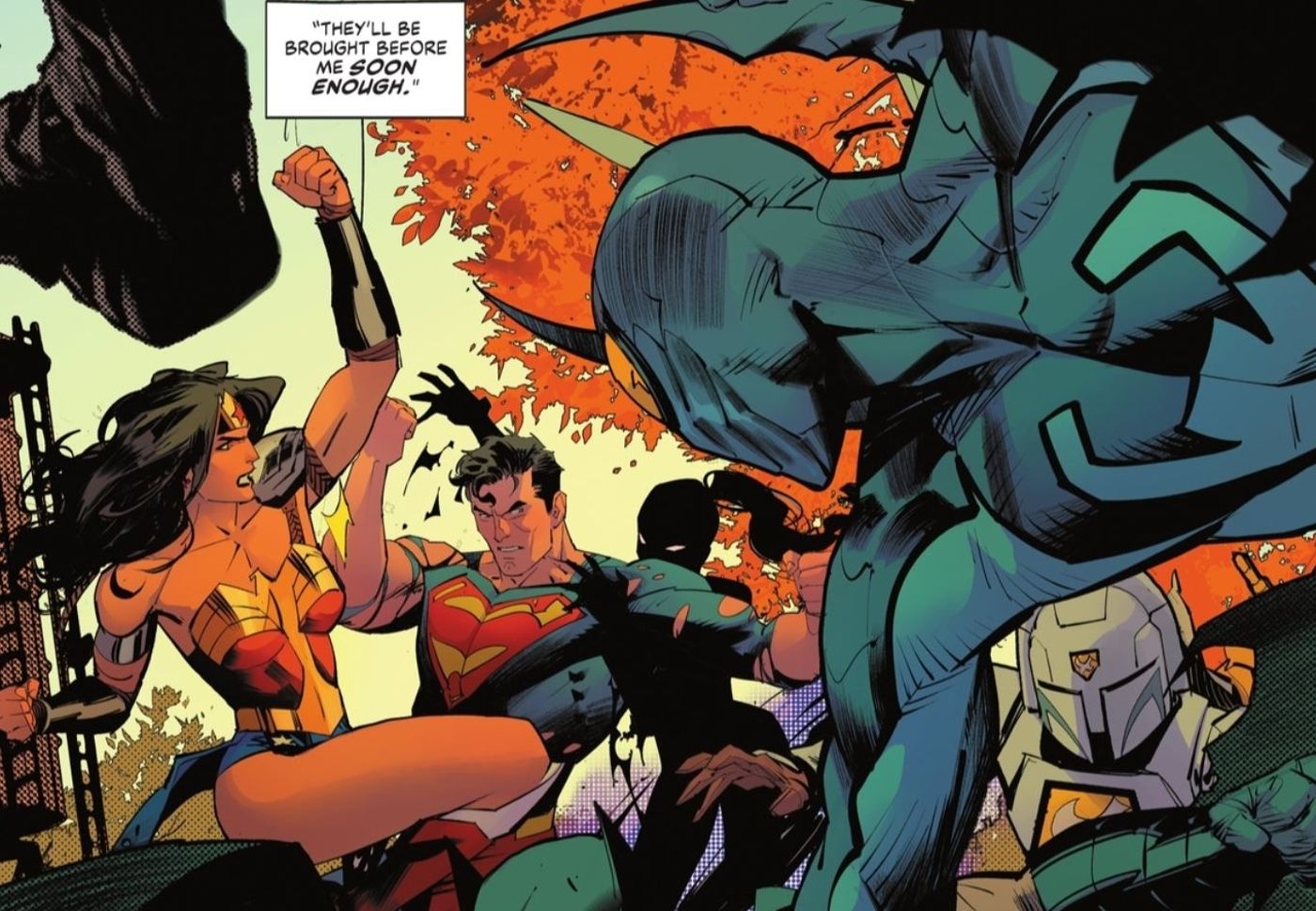 “/> A pesar de las abrumadoras probabilidades, Superman y Batman logran mantener a raya muchas de las variantes de la Liga de la Justicia. Sin embargo, para sorpresa de Batman, esta Liga también cuenta con héroes originales en sus filas. El caballero oscuro brevemente se encuentra con un héroe muy parecido a Spider-Manaunque con una combinación de colores amarillo y negro con púas adornando su atuendo y un chaleco con capucha a juego.