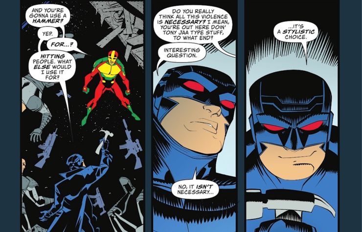 El uso de un martillo como arma ofensiva se ha asociado durante mucho tiempo con Thor, pero las cualidades mágicas de Mjolnir parecen haber cambiado algo de su brutalidad. Se puede ver a Thor usando a Mjolnir para conjurar un devastador relámpago, ordenándole que vuele hacia adelante y golpee a sus oponentes en su ausencia o incluso girándolo mientras lo ayuda a volar por el aire. Los efectos de sonido cómicos y los poderes divinos quitan el hecho de que el martillo está hecho de metal sólido Uru, capaz de romper huesos o incluso matar personas. Midnighter usa su martillo de manera similar, balanceándolo o incluso tirándolo a sus oponentes, pero sus acciones se sienten más alineadas con personajes como Oh Dae-su de Chico mayor o como dice Mister Miracle, el artista marcial Tony Jaa. Los creadores de Midnighter incluso le permiten al vigilante hiperviolento un momento en el que admite que la violencia podría evitarse o incluso ser innecesaria, pero lo disfruta haciendo que el martillo sea un “elección estilística”.