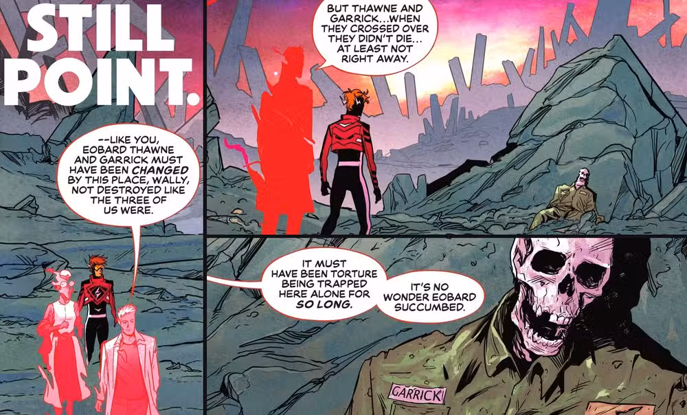 El origen y la naturaleza de los velocistas de DC han dado un vuelco en Absolute Flash, con Thawne, un científico de la era de la Segunda Guerra Mundial, rompiendo un todo en una dimensión alternativa vinculada a la velocidad ahora denominada “Still Point”. Pero cuando Garrick intentó abortar el imprudente plan de Thawne, el futuro villano atacó, condenando a Garrick a morir de hambre… y condenándose a sí mismo a una pesadilla diferente. Pero al menos Garrick lo intentó.