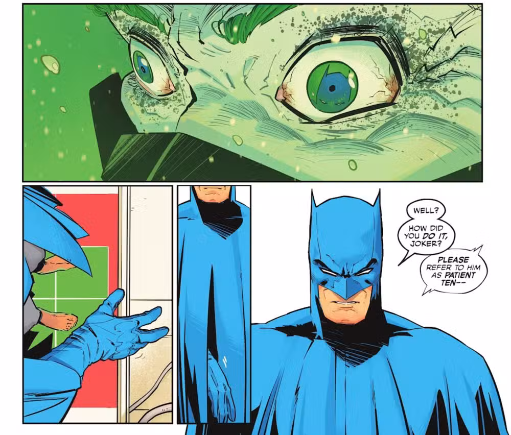 En su nuevo estado, Joker es conocido como Paciente Diez, nombre que le dio el Dr. Zeller, responsable de su transformación y curación. A pesar de su insistencia, es un nombre que Batman se niega a usar, desconfiado de la aparente cordura del Joker. Sin embargo, incluso él está conmocionado por las últimas palabras del Joker…