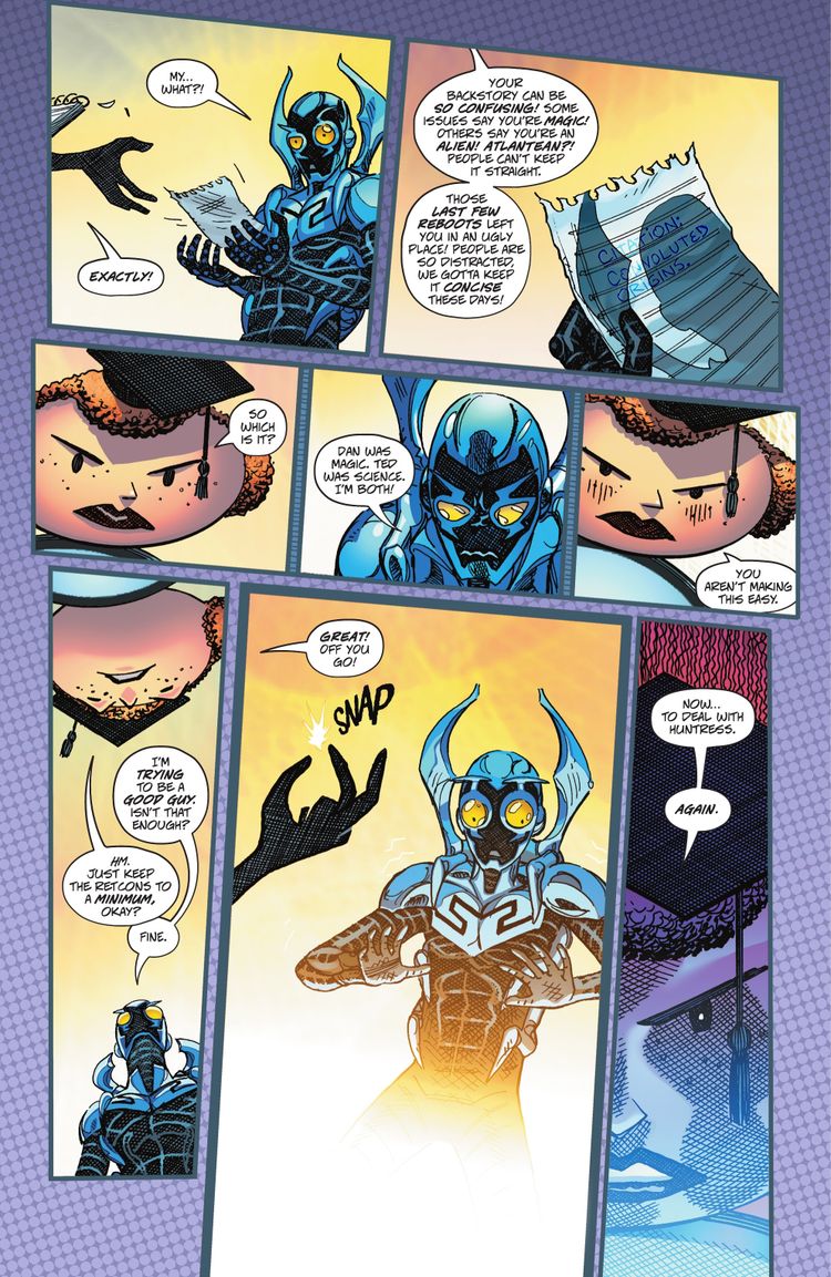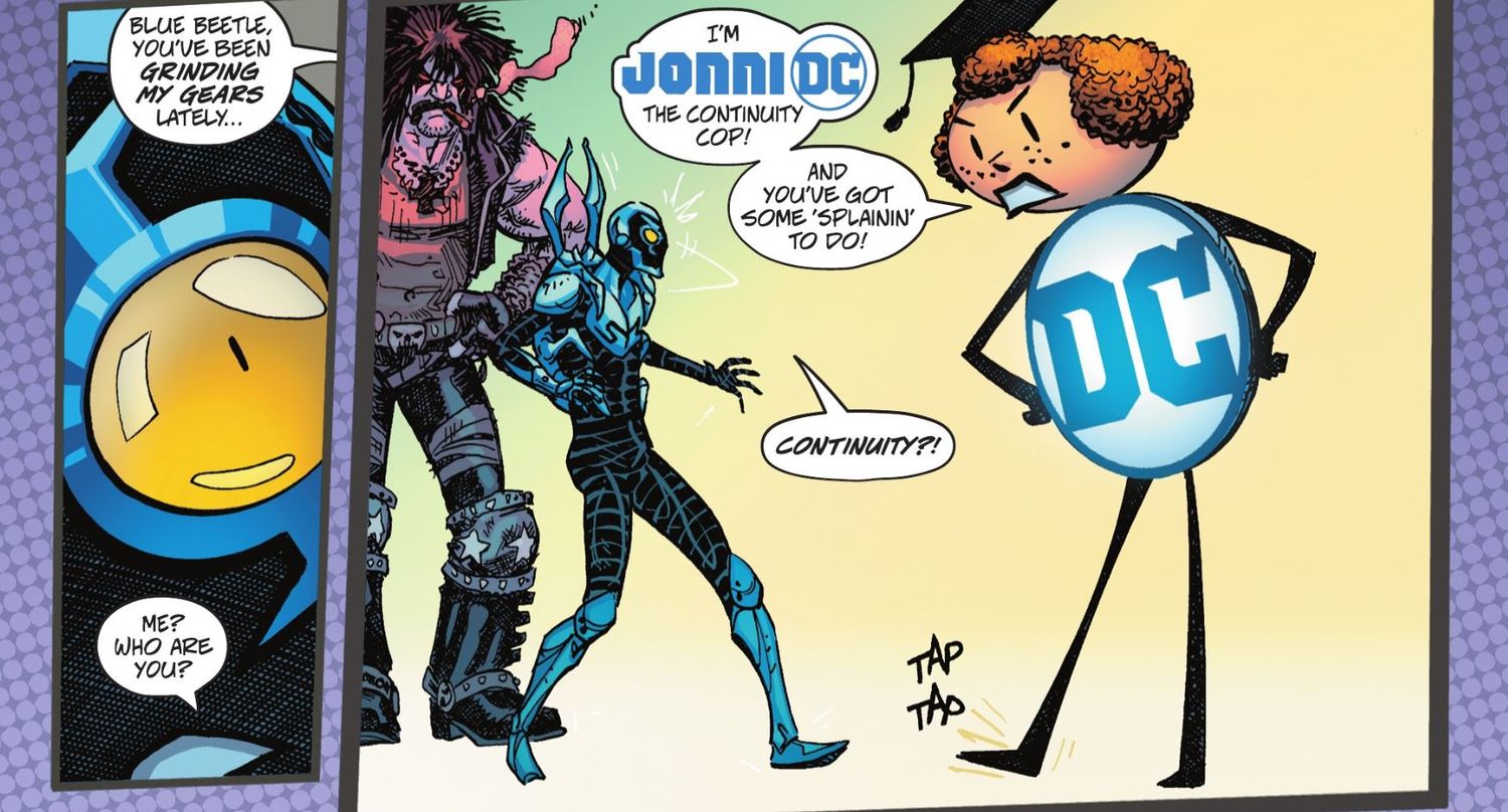 Desafortunadamente, el viaje de Blue Beetle es monitoreado por varios héroes desprevenidos como Heckler y G’nort. Finalmente, Lobo lleva a Jaime con su jefe y el de los demás, Jonni DC, Continuity Cop. Jonni DC cita a Blue Beetle por tener un origen confuso pero lo deja ir siempre que Jaime prometa mantener los retcons al mínimo.