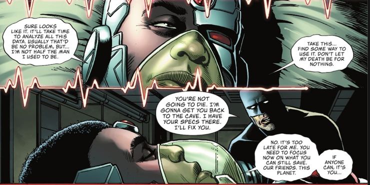 Batman y Cyborg tienen un historial de ser amigos cercanos dentro de la Liga de la Justicia. Geoff Johns y Jim Lee Liga de la Justicia ejecutar durante DC Nuevo 52 era presentaba en gran medida al dúo como confidentes del equipo. Johns destaca el hecho de que ambos hombres son extremadamente inteligentes y tienen una mentalidad estratégica, y la vasta base de datos de información de Cyborg complementa la perspicacia de Batman como detective. Es una relación agradable que permite que estos dos hombres, a veces aislados por sus propias tragedias y mentes altamente activas, graviten naturalmente el uno hacia el otro como espíritus afines. Este parentesco hace que los momentos finales de Cyborg sean aún más desgarradores, ya que sus últimas palabras están dedicadas a su fe en su asociación: “Debe concentrarse ahora en lo que aún puede ahorrar,dice Víctor.Nuestros amigos. este planeta Si alguien puede, eres tú…”