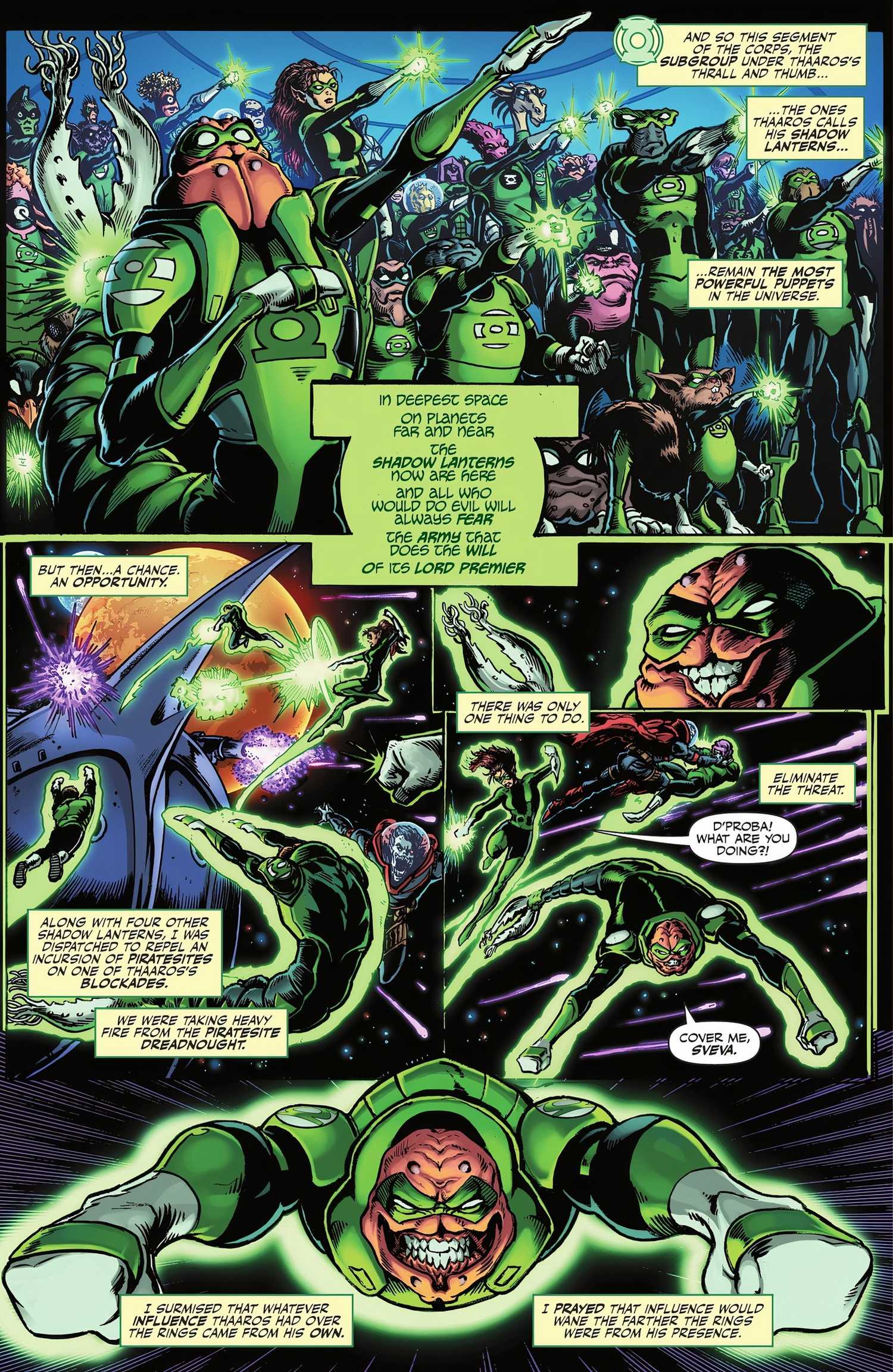 “The Shadow Lanterns” fue escrito por Marc Guggenheim y dibujado por Darick Robertson. Shint D’Proba, un nuevo recluta del Green Lantern Corps. D’Proba se siente honrado de ser contado entre ellos, pero no puede quitarse la sensación de que algo anda mal, particularmente con el líder de UP, Thaaros. D’Proba luego es incluido en un subgrupo especial de Linternas, llamado “los Linternas de las Sombras”.