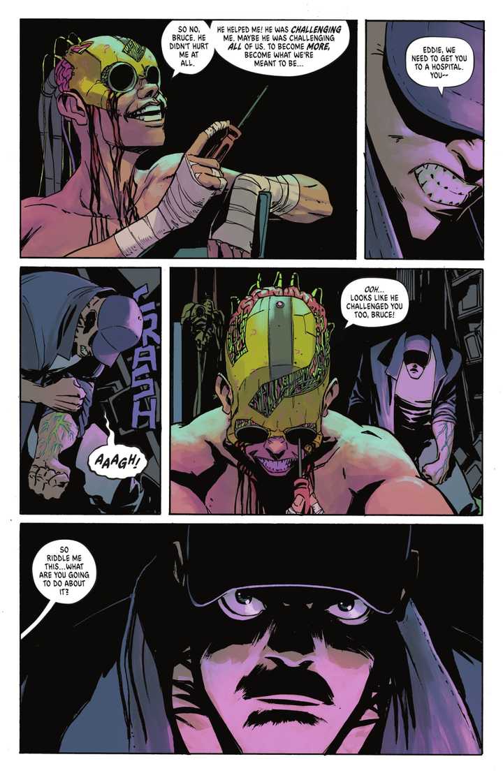 El castigo de Nygma fue igualmente personal. A diferencia de Harvey y Oswald, Edward no fue hospitalizado, pero no escapó ileso. Bane primero lo desafió a una batalla de ingenio, y después de ganar, lo cegó brutalmente al conducir sus dedos a los ojos de Edward. Luego sacudió la cabeza de Nygma tan violentamente y durante tanto tiempo que su lóbulo frontal estaba severamente dañado, dejándolo medio loco. Juntos, Batman’s Los amigos acaban de recibir sus horribles historias de origen del villano.