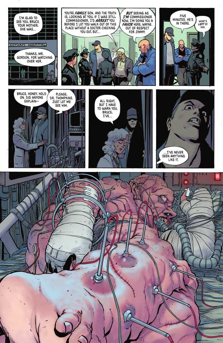 Después de enterarse de que sus amigos fueron atacados por Bane, Bruce los visita en el hospital, comenzando con Oswald. Una vez ágil, Oswald se muestra desnudo y rizado en la posición fetal en su cama, su cuerpo grotescamente hinchado, que se asemeja a una gota de carne de dolor en lugar de un hombre. La imagen es completamente repugnante, capturando el alcance horrible de su sufrimiento.