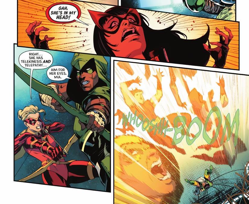 Ivo huye, enfureciendo a Tomorrow Woman, quien dice que Ivo le prometió que la arreglaría y la ayudaría a ser miembro de la Liga de la Justicia nuevamente. Culpando al equipo por perseguir a Ivo, Tomorrow Woman ataca. El Equipo Flecha no está preparado para los poderosos movimientos telepáticos y telequinéticos de Tomorrow Woman. Connor Hawke intenta que sus aliados le disparen a los ojos, pero antes de que se den cuenta de lo que sucedió, Tomorrow Woman tiene al equipo suspendido a varios cientos de pies en el aire. Arsenal le pide que los baje, Sólo para que Tomorrow Woman los envíe a todos al suelo..