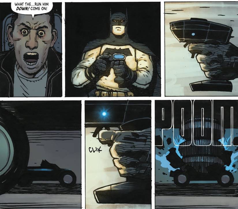 En Batman absoluto #4 de Scott Snyder, Gabriel Hernández Walta, Frank Martin y Clayton Cowle, Bruce emprende su primera misión como Batman. Ha estado investigando el transporte de armas ilegales y finalmente localizó un puesto de control para detener la operación, y despliega un pequeño y básico dispositivo para lograr ese objetivo.