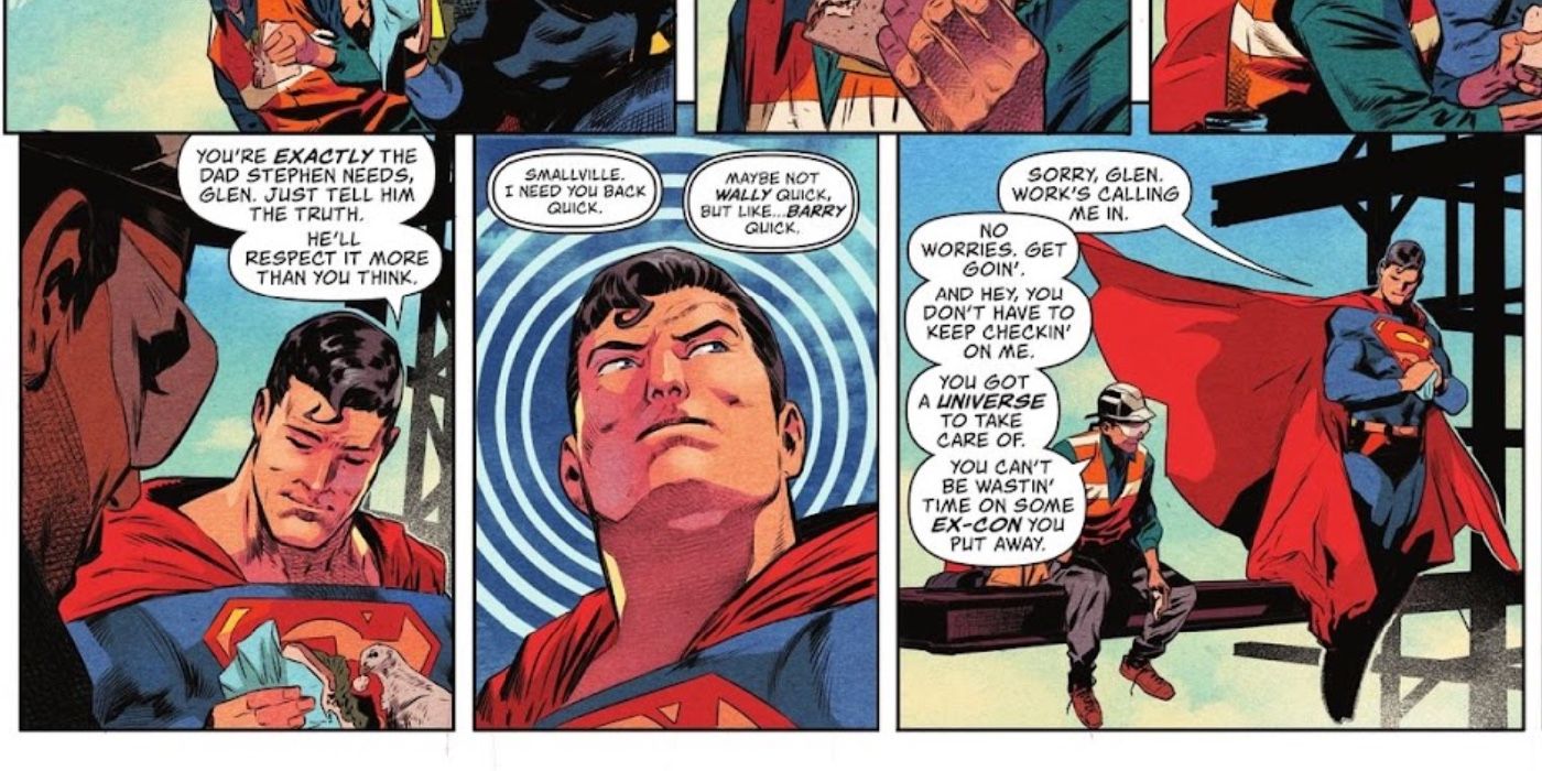 Cómics de acción #1057 por Philip Kennedy Johnson, Rafa Sandoval, Matt Herms y Dave Sharpe encuentra el almuerzo del Hombre de Acero interrumpido cuando su esposa y editora, la única Lois Lane, aprovecha la súper audiencia de Clark y lo llama para que regrese. El planeta diario. Para captar la atención de su marido, Lois dice: “Smallville, necesito que regreses rápido. Tal vez no Criajo rápido, pero como…barry rápido.“