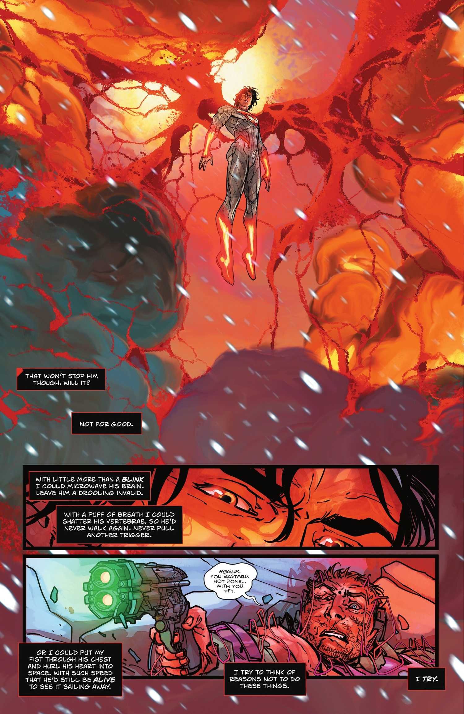 El monólogo interno de Superman lo pone al descubierto: “Con poco más que un parpadeo, podría microondas su cerebro. Déjelo un babeante inválido. Con un aliento, podría romper sus vértebras, por lo que nunca volvería a caminar. Nunca tire de otro gatillo. O podría poner mi puño a través de su pecho y lastimar su corazón en el espacio. Con tanta velocidad que todavía estaría vivo para verlo navegando “.