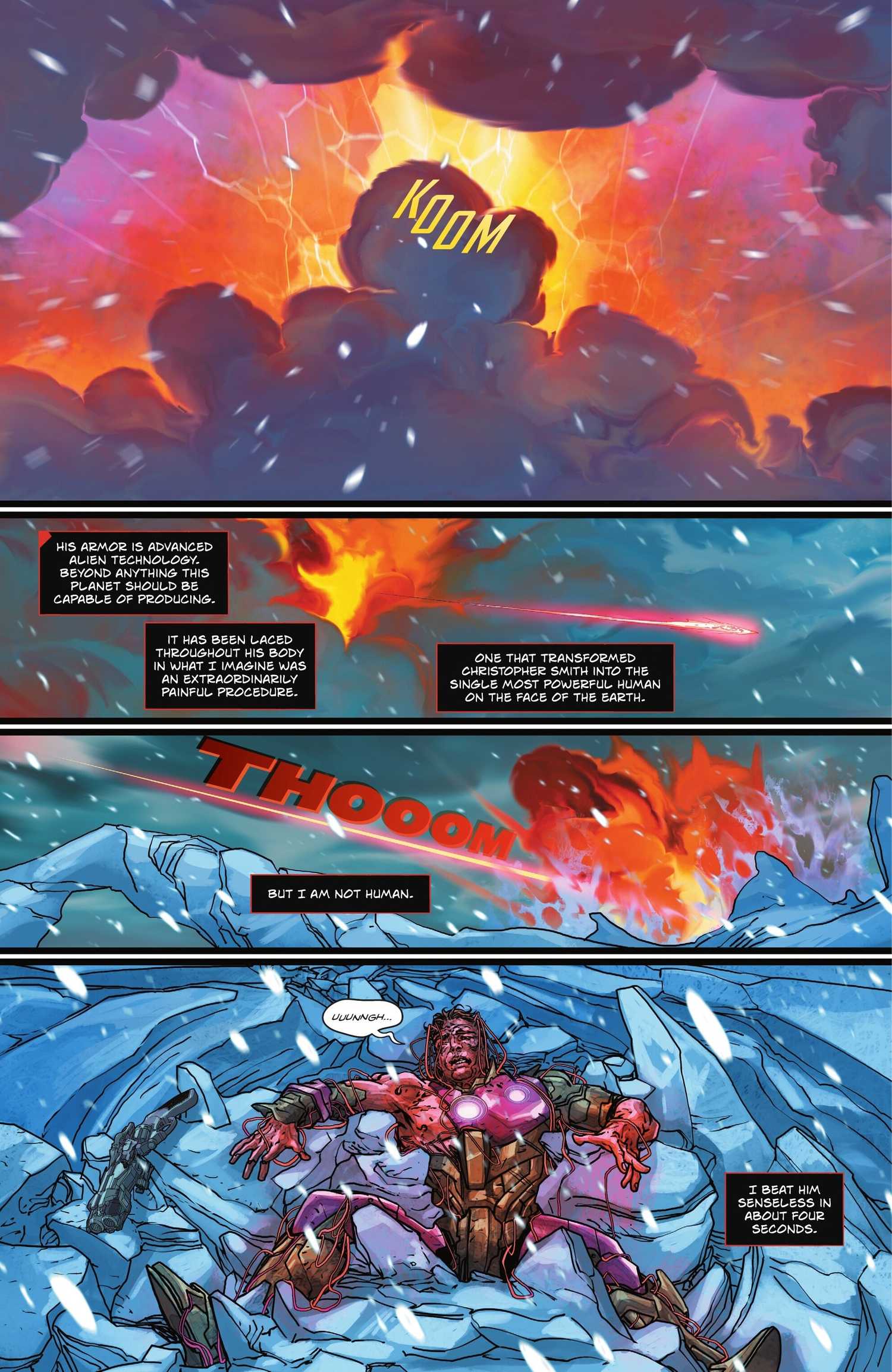 Superman absoluto #10 trae al hombre de acero y pacificador de regreso a la batalla, pero esta vez Kal no le da a Smith la oportunidad de disparar una bala de kriptonita. Como Narra Superman, solo lo lleva “Aproximadamente cuatro segundos” to vencer al pacificador sin sentido, dejándolo ensangrentado, roto y completamente a merced de Superman.
