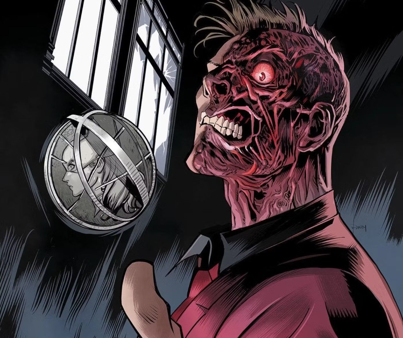 El aterrador nuevo diseño de Two-Face se vio por primera vez en las páginas de Batman: White Knight presenta – Generación Joker #5. Esta historia ve a los hijos del Joker, Bryce y Jackie, tratando de devolverle la vida a su padre Jack, una versión cuerda del Joker. Naturalmente, esto no resulta ser una tarea fácil y, finalmente, la pareja encuentra el secreto más oscuro del Joker.