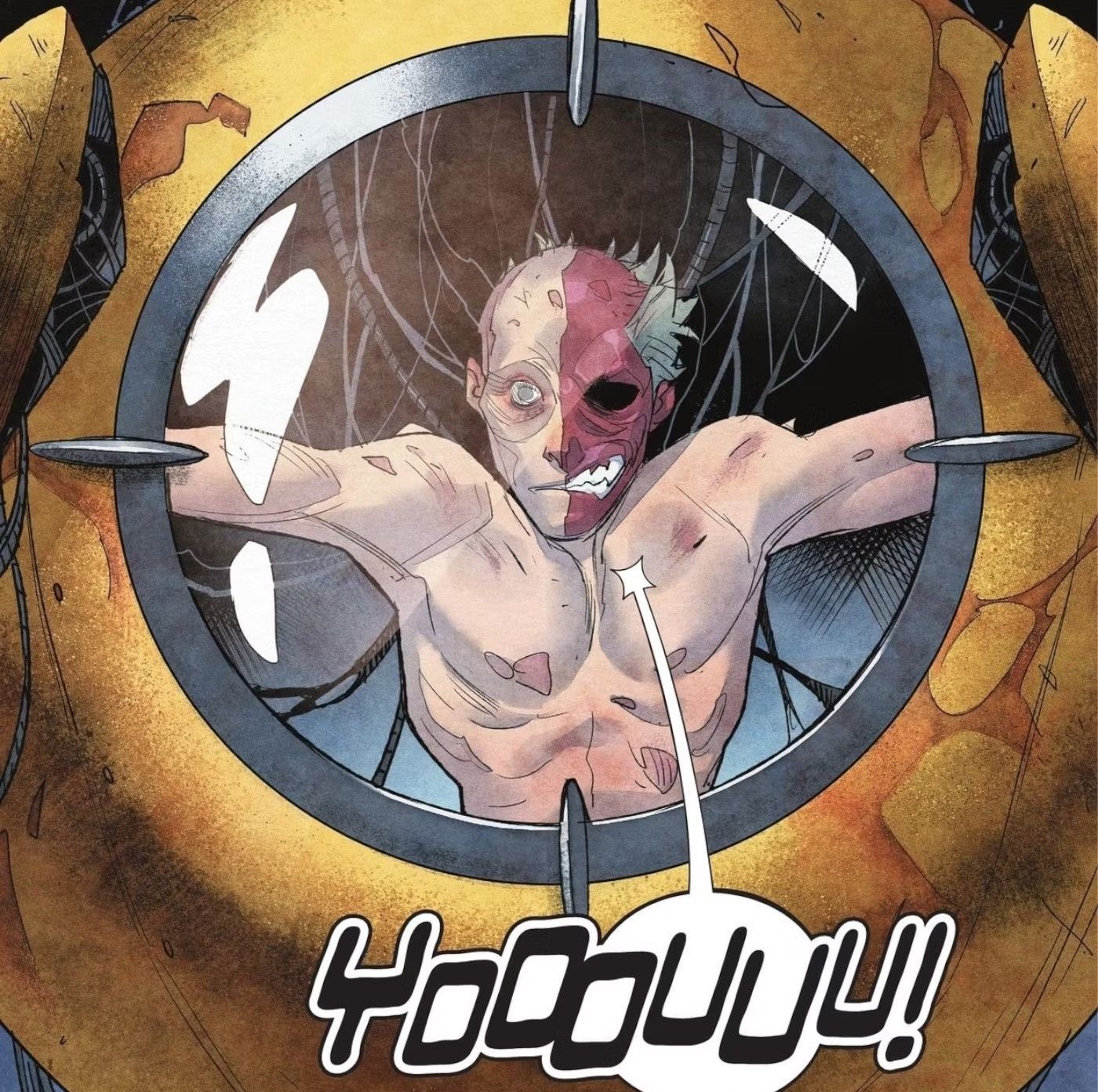 Sin embargo, la decisión de dividir a Joker en dos personajes distintos, Jack y Joker, convierte a Two-Face en el candidato perfecto para el experimento de Jack. Jack quería estar ahí para sus hijos, verlos envejecer, pero sabía que su tiempo era limitado. Quería crear una copia de seguridad digital de su conciencia sin empoderar al Joker, y Two-Face, con sus propias personalidades duales, lo convirtió en el candidato perfecto para las pruebas de Jack. Esto resultó en que Jack conectara a Two-Face a una máquina y esencialmente lo dejara allí durante años. Naturalmente, Two-Face no está feliz de volver a ver a Jack y ha sido desatado en Gotham City, esencialmente ahora un tanque andante.