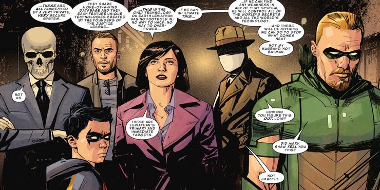 Lois Lane reúne al equipo; Talia y Damian Wayne también se unen a ellos. Lois revela la existencia de la red y que Shaw y Leviathan no pueden piratearla, la única red en la Tierra a la que no tienen acceso. La red fue creada por los fundadores de la Liga de la Justicia, y solo tres ubicaciones pueden acceder a ella: la Baticueva, el Salón de la Justicia y la Fortaleza de la Soledad. Si Shaw puede acceder a cualquiera de estos y obtener el control de la red, Lois dice que nadie, ni siquiera Superman o Batman, podrá detenerlo. Shaw había teletransportado previamente a Lois Lane lejos de él y al Salón de la Justicia, en busca de una entrada a la red; esto le indicó a Lois su plan. Los demás sienten curiosidad por esta red, ya que ninguno de ellos la conocía; ni siquiera Green Arrow, un incondicional de la Liga de la Justicia, estaba al tanto de su existencia.