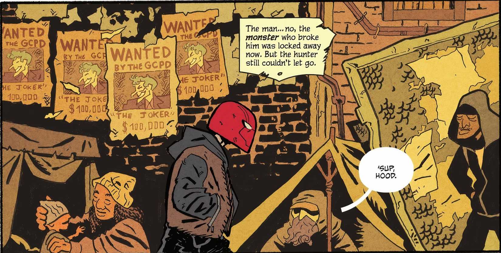Sin embargo, el Príncipe Payaso del Crimen no hace una aparición física, sino que sigue siendo una presencia inminente sobre Gotham City. Esta presencia se ve acentuada por carteles de búsqueda pegados por toda la ciudad, ofreciendo una recompensa de 100.000 dólares por su captura.