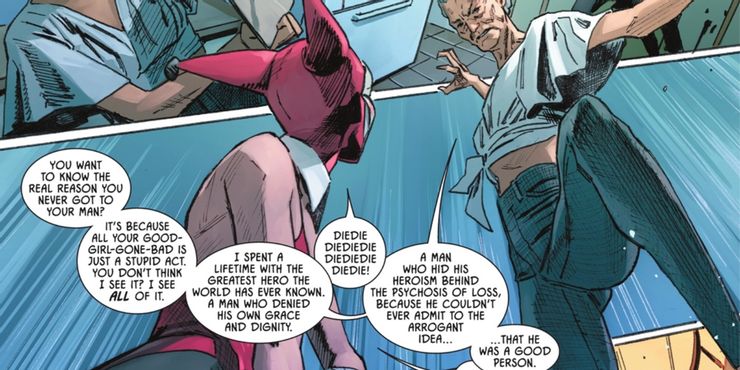 Por un tiempo, Catwoman se burla de Harley mientras el bufón continúa con su violenta diatriba, hasta que Selina finalmente pierde la paciencia y comienza a descargar sobre su agresor, diciendo que todo el truco de Harley de “niña buena que se volvió mala” ha sido un acto desde el principio. . Catwoman basa su afirmación bastante audaz en el hecho de que, después de pasar años y conocer a Batman bastante bien, había demasiado de él en Harley: “Mira, Harley, el problema es, por qué no pudiste hacerlo, por qué nunca lo hiciste, eres demasiado bueno para ser malo.“Y la razón por la que Catwoman podría hacer la escritura es porque ella”demasiado malo para ser bueno.“Selina definitivamente golpea algunos nervios durante este intercambio, ya que, cuanto más habla Catwoman, más beligerante y agitada se vuelve Harley, insinuando que puede haber algo de verdad detrás de sus palabras.