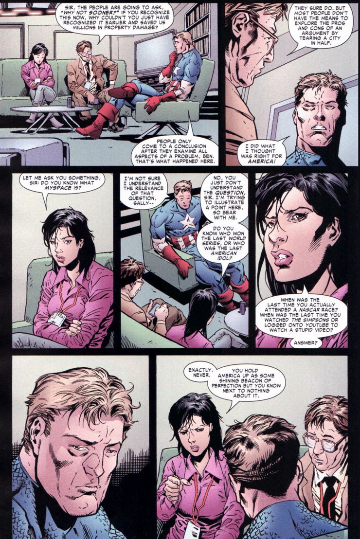 No vivir junto a otros ha diferenciado a Bruce de sus compañeros gothamitas, en un sentido muy literal. Esta situación es similar a la del Capitán América en 2007. Civil War: Frontline # 11—con algunas salvedades importantes. En el tema, Steve Rogers es abordado por un periodista decidido (evidentemente la pesadilla de los superhéroes en los universos Marvel y DC) que pregunta infamemente: “¿Sabes qué es MySpace? ¿Sabes quién ganó la última Serie Mundial, o quién fue el último American Idol? ¿Cuándo fue la última vez que asististe a una carrera de NASCAR? ¿Cuándo fue la última vez que viste Los Simpson o iniciaste sesión? YouTube para ver un video estúpido? ” Ella toma el silencio de Rogers como algo negativo y continúa: “Consideras a Estados Unidos como un faro brillante de perfección, pero no sabes casi nada al respecto”.