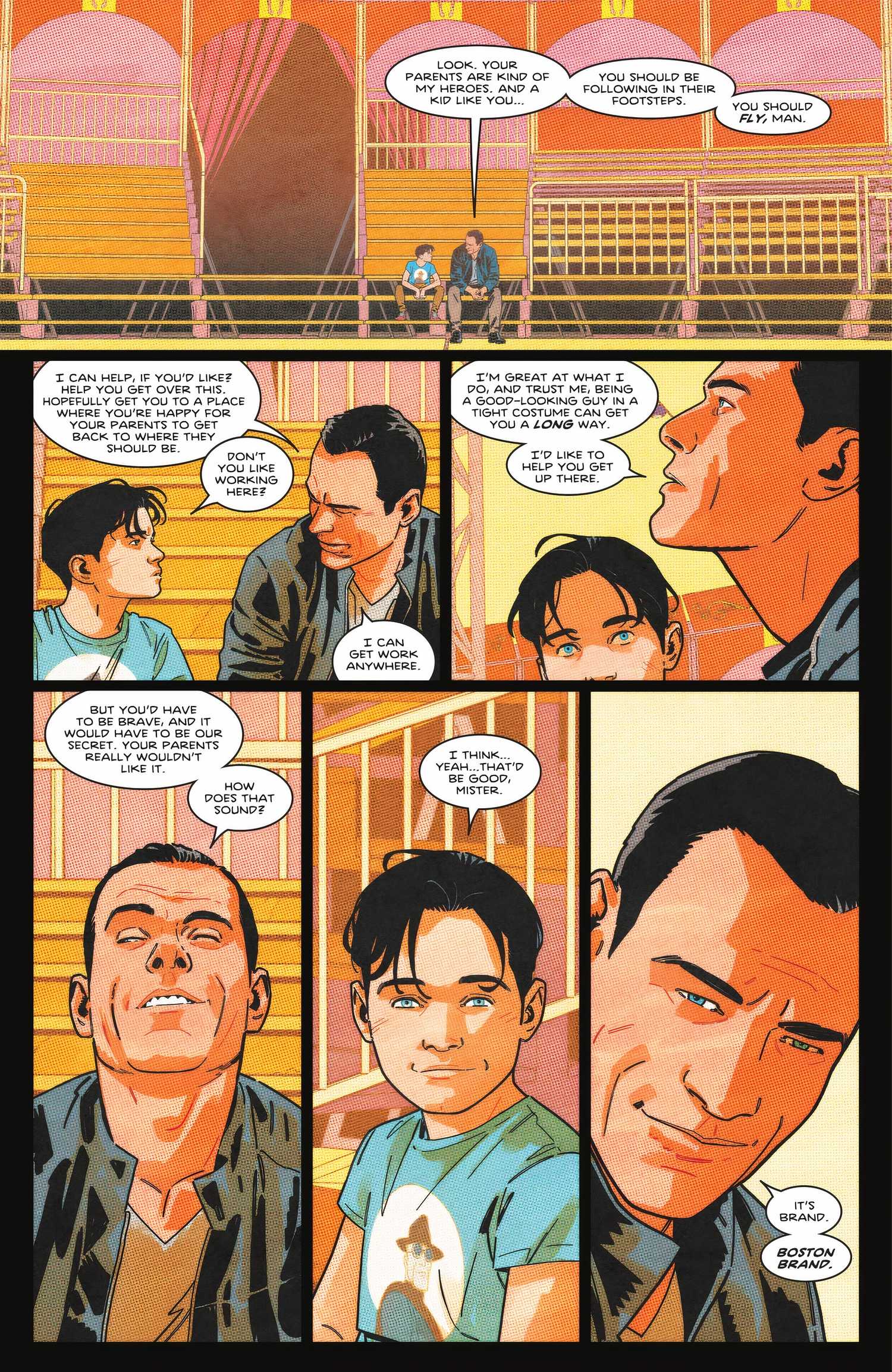 Luego se ofrece a enseñarle a Dick a superar su miedo a las alturas para que él y sus padres puedan regresar al aire, donde pertenecen. Cuando Dick acepta, el acróbata se presenta como Boston Brand. El flashback termina aquí, pero como muchos fanáticos saben, Boston Brand eventualmente moriría y se convertiría en el icónico héroe de la Liga de la Justicia Oscura, Deadman. Aunque Brand no era Deadman en el momento de su encuentro con Dick, técnicamente sigue siendo el primer héroe que Nightwing conoció. En cierto modo, Este encuentro confirma que siempre fue el destino de Dick estar conectado a la comunidad de héroes y convertirse él mismo en un héroe..