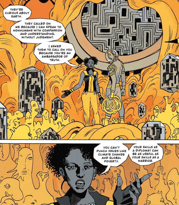 Del mismo modo, Wonder Woman también fue convocada por sus valores y expresión de los mismos. La guerrera amazónica valora la verdad y ha buscado difundir su importancia a lo largo de su historia. Este es un rasgo valioso para la diplomacia, ya que no busca beneficios personales ni ventajas sobre los demás. Ella es honesta y compasiva de una manera similar a Vixen, aunque se manifiesta de manera diferente. Diana ya ha sido vista en empresas diplomáticas en la Tierra, desde que llegó al mundo del hombre desde Themyscira, uniendo ambos a su manera. Wonder Woman tiene experiencia en la construcción de puentes, lo que la convierte en una candidata perfecta para los esfuerzos de la diplomacia galáctica, como la que se presenta en este número.
