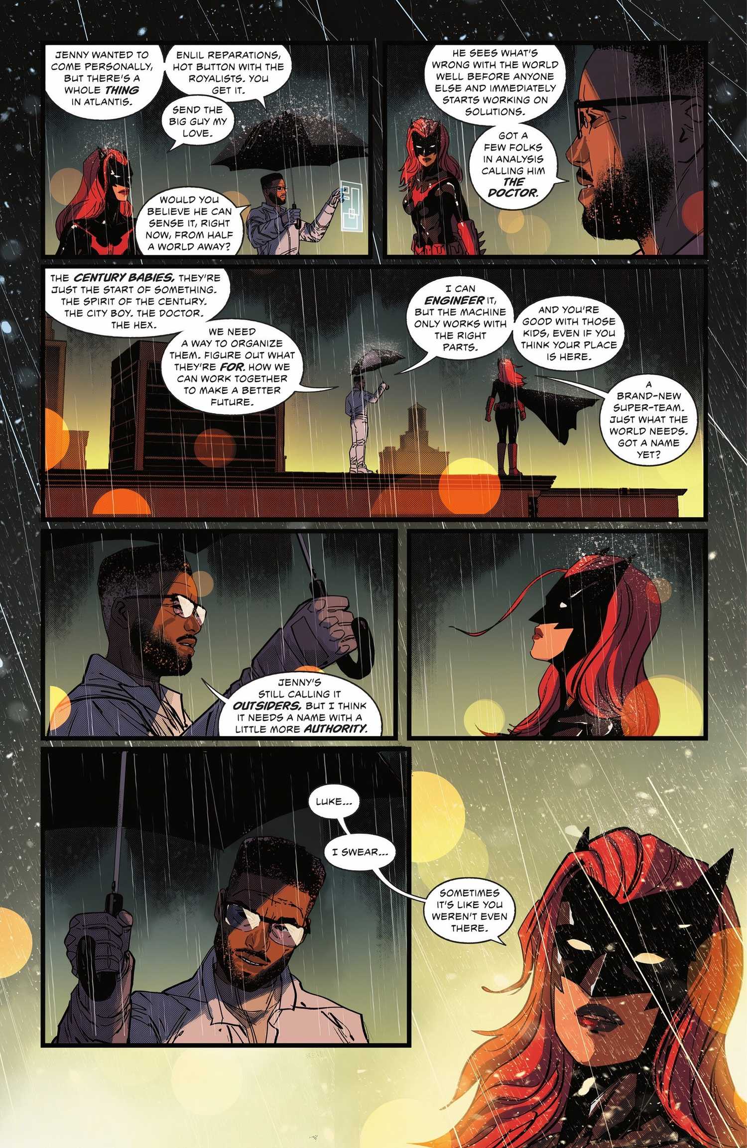 Forasteros El número 11 está escrito por Jackson Lanzing y Collin Kelly y dibujado por Robert Carey. Jakita Wagner, que estaba dispuesta a destruir el universo, estaba convencida de su error. Varios meses después, los excompañeros de equipo de Jakita, Batwoman y Luke Fox, están reflexionando sobre su época como Forasteros. Luke le dice que quiere organizar a los “Century Babies” en un equipo. Batwoman, un poco exasperada, le pregunta a Luke cómo planea llamar al equipo.