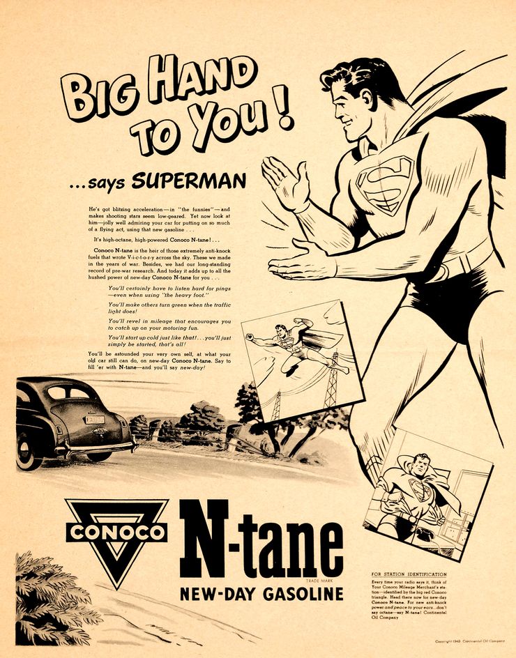 “El Hombre de Acero se había vuelto viral y los comerciantes querían ir con él… Superman, Inc., ofrecía algo para todos los gustos y edades. Los padres podían empapar su cereal con leche de Superman, enjabonarse con crema de afeitar de Superman, agregar capucha de Superman adornan sus autos y luego se alejan usando gasolina de alto octanaje certificada por Superman. Este último dejó especialmente claro que lo único que se necesitaba para hacer una asociación con el Hombre del Mañana era un cliente dispuesto a pagar”.