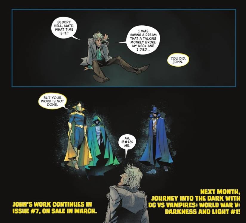 Mientras tanto, el DC contra vampiros El universo se expande con la introducción del Doctor Fate, el Espectro y el Extraño. Tras la muerte de John Constantine a manos de Gorilla Grodd, quien le rompió el cuello, John se encuentra despertando en un plano de existencia alternativo. Allí, se enfrenta a las tres entidades dominadas. Informan a Constantino que su “el trabajo aún no está terminado” en la guerra en curso. Por lo tanto, ahora que el Doctor Destino, el Espectro y el Extraño se involucran en la guerra, El conflicto entre vampiros y humanos ahora enfrenta la intervención de cuatro de las fuerzas más formidables de DC, preparando el escenario para una confrontación aún más explosiva.