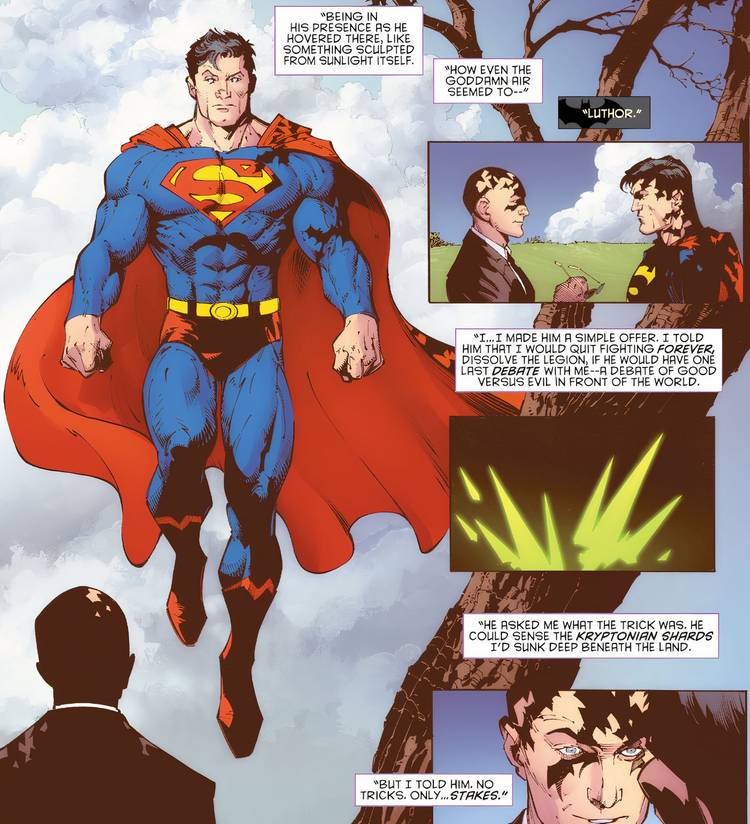 Superman y Lex Luthor acuerdan un debate frente a todo el mundo, y el perdedor es empalado instantáneamente por picos de kryptonita. Como Luthor no tiene ninguna duda de que va a ganar, escucha legítimamente el discurso de Superman. Con lo que Luthor no cuenta es con que termine conmovido por lo que dice Superman. El argumento de Superman por un mundo mejor inspira a Lex, por eso es desgarrador cuando la humanidad se pone del lado de Lex, y Superman muere instantáneamente por los picos de kryptonita. Luego, Lex pasa el resto de su vida tratando de traer otro Superman a la Tierra.