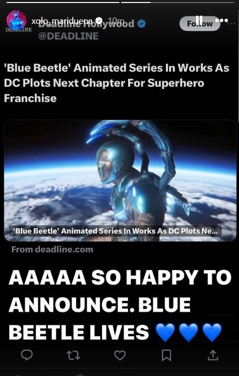 Maridueña respondió poco después de que saliera la noticia de Blue Beetle, aparentemente confirmando su participación. Al momento de la publicación de esta historia, Gunn no ha comentado sobre la historia.