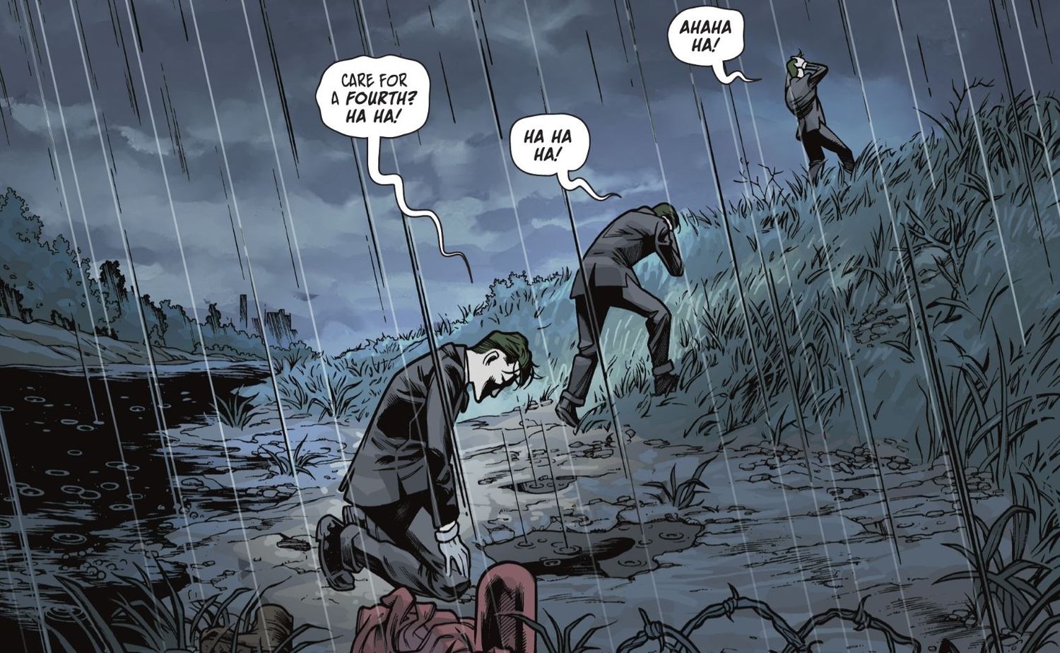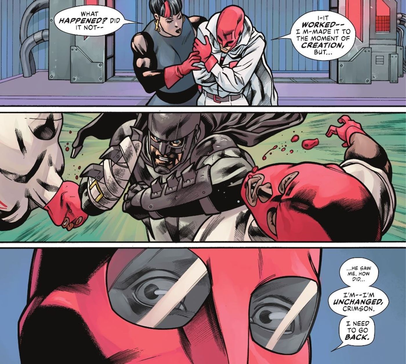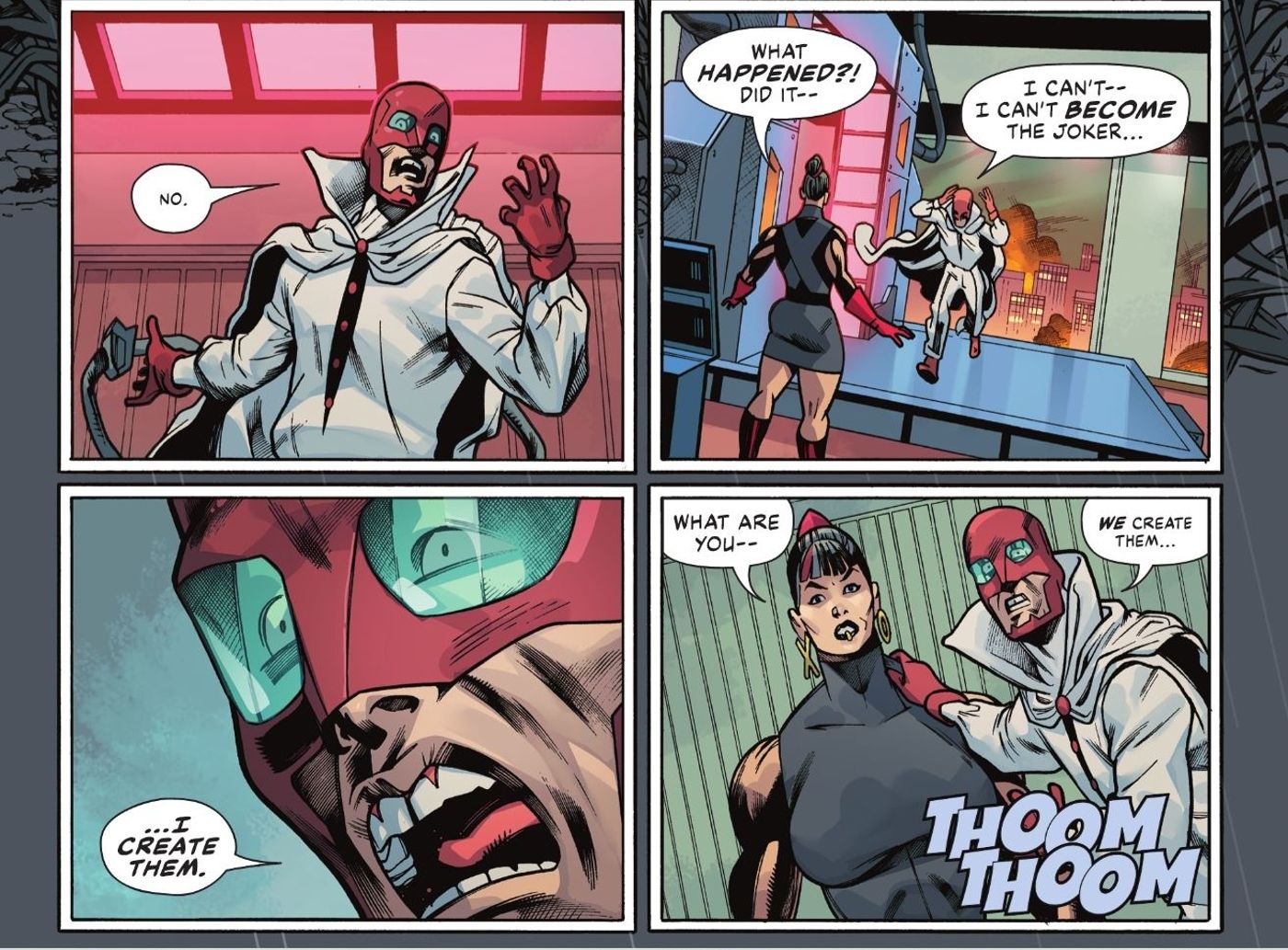 La novia y pareja de Halliday, Crimson, prepara la máquina para que Red Mask lo intente una vez más. Se ata y una vez más regresa al momento de la creación de Joker. Pero cuando Halliday ve el mundo a través de los ojos del villano, el Guasón se mete en la cabeza de Máscara Roja y sugiere que los experimentos de Halliday son los que crearon al Guasón. Las palabras de los villanos resultan ciertas, ya que se revela que los repetidos atisbos de Halliday sobre el origen del Guasón han creado dos copias adicionales del payaso.