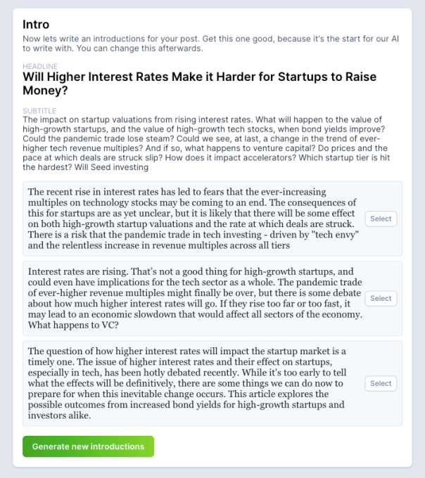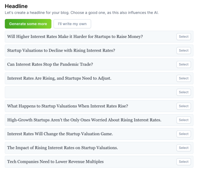 ¡Es hora de dar el siguiente paso! Al presionar el botón, apareció una lista de posibles titulares para la publicación que estaba ayudando a crear, que honestamente no eran terribles: