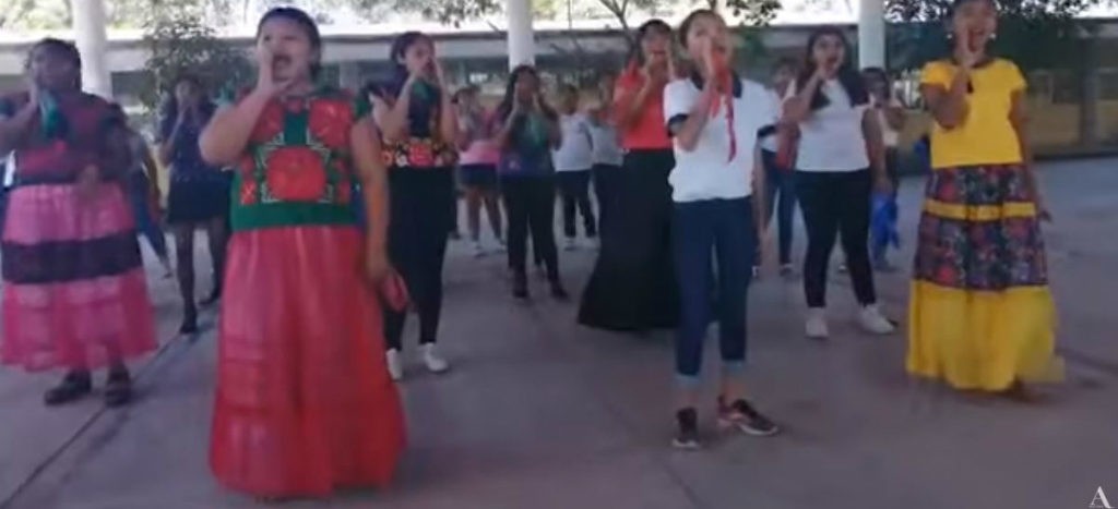 Las jóvenes entre 12 y 14 años decidieron unirse a este cántico feminista para que su voz sea escuchada de Juchitán para el mundo, lo iniciaron vendadas de los ojos y boca con una pañoleta que se quitaron cuando entonaron “Es la violencia que no ves” y con el cual ahora intentan hacer conciencia con los suyos en esta región de Oaxaca.