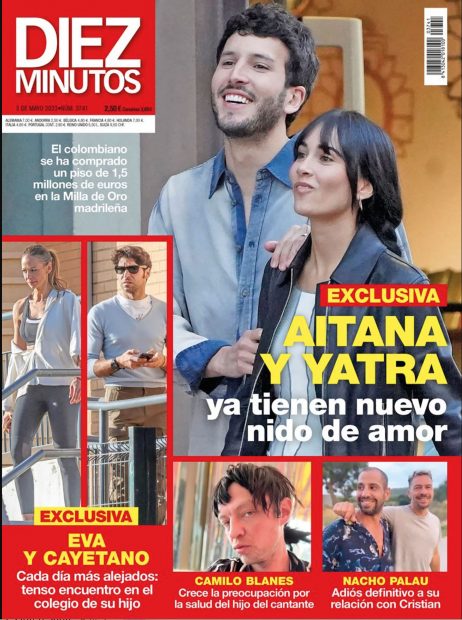 Por último Diez Minutos revela los detalles del nuevo hogar que el cantante Sebastián Yatra ha adquirido en Madrid, para estar más cerca de Aitana. La revista recoge también las fotografías de un tenso enfrentamiento entre Eva González y Cayetano Rivera, así como la preocupante situación de Camilo Blanes, hijo de Camilo Sesto. Cierra la portada la ruptura de Nacho Palau y su novio, Cristian.