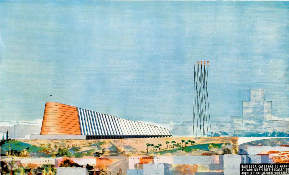 Neorrománica la cripta, neogótico el interior, neoclásico el exterior de La Almudena. Y neos también eran muchos arquitectos que mediado el siglo XX siguen defendiendo esas vueltas al pasado. Pero, para nueva de verdad, la vanguardia. Dos arquitectos, Francisco de Asís Cabrero y Rafael Aburto presentan para la Bienal una propuesta para un templo de dimensiones descomunales y forma insólita para las catedrales, erigidas hasta entonces sobre plantas en forma de cruz: quieren que como una proa de planta triangular se asome al Manzanares en los terrenos del Cuartel de la Montaña. Saben que la forma va a chocar: “No pretendemos que nuestro proyecto fuese popular, sino, por el contrario, aportar una emoción nueva en formas”, y la elegida es fruto del “estudio lógico de la compleja función de una catedral, como monumento litúrgico y edificio utilitario que no puede ser malograda en aras de un aburrido mimetismo”.