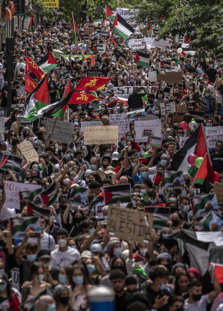 Miles de personas salieron este sábado a la calle en numerosas ciudades de Europa, desde Madrid a Londres o Berlín, pero también otros lugares del mundo, como Bagdad o Túnez, en apoyo a los palestinos. Las protestas, convocadas originalmente para conmemorar el 73º aniversario de la Nakba (catástrofe), que marca el inicio del éxodo de cientos de miles de palestinos desde la creación del Estado de Israel en 1948, se transformaron en una muestra de rechazo a los bombardeos del Ejército israelí contra la franja de Gaza y otras operaciones militares. Aunque la mayoría se celebraron de forma pacífica, hubo algunos altercados, como en París, donde las autoridades habían prohibido la manifestación alegando el precedente de una marcha similar en 2014 que degeneró en episodios de violencia.