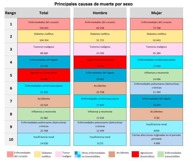 Por problemas de salud, las tres principales causas de muerte tanto para hombres como para mujeres son: enfermedades del corazón (156 041, 23.5%), diabetes mellitus (104 354, 15.7%) y tumores malignos (88 680, 13.4%).