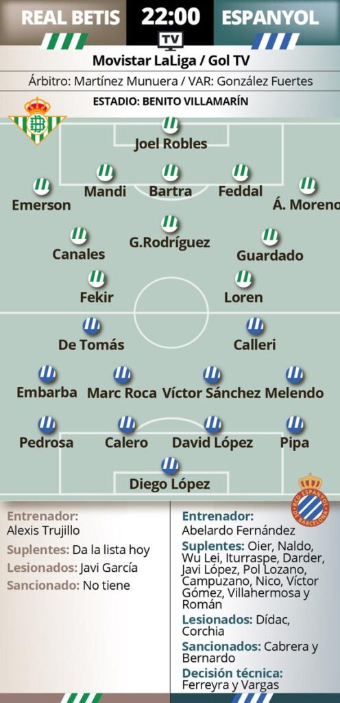 En el eje del ataque Alexis cuenta con Borja Iglesias para hacer competencia a Loren y con otras opciones de índole secundario que pasarían por nombres como Carles Aleñá, el mexicano Diego Lainez o Juanmi Jiménez, recuperado ya de su fascitis plantar. Partido eléctrico el que se jugará en el Villamarín.