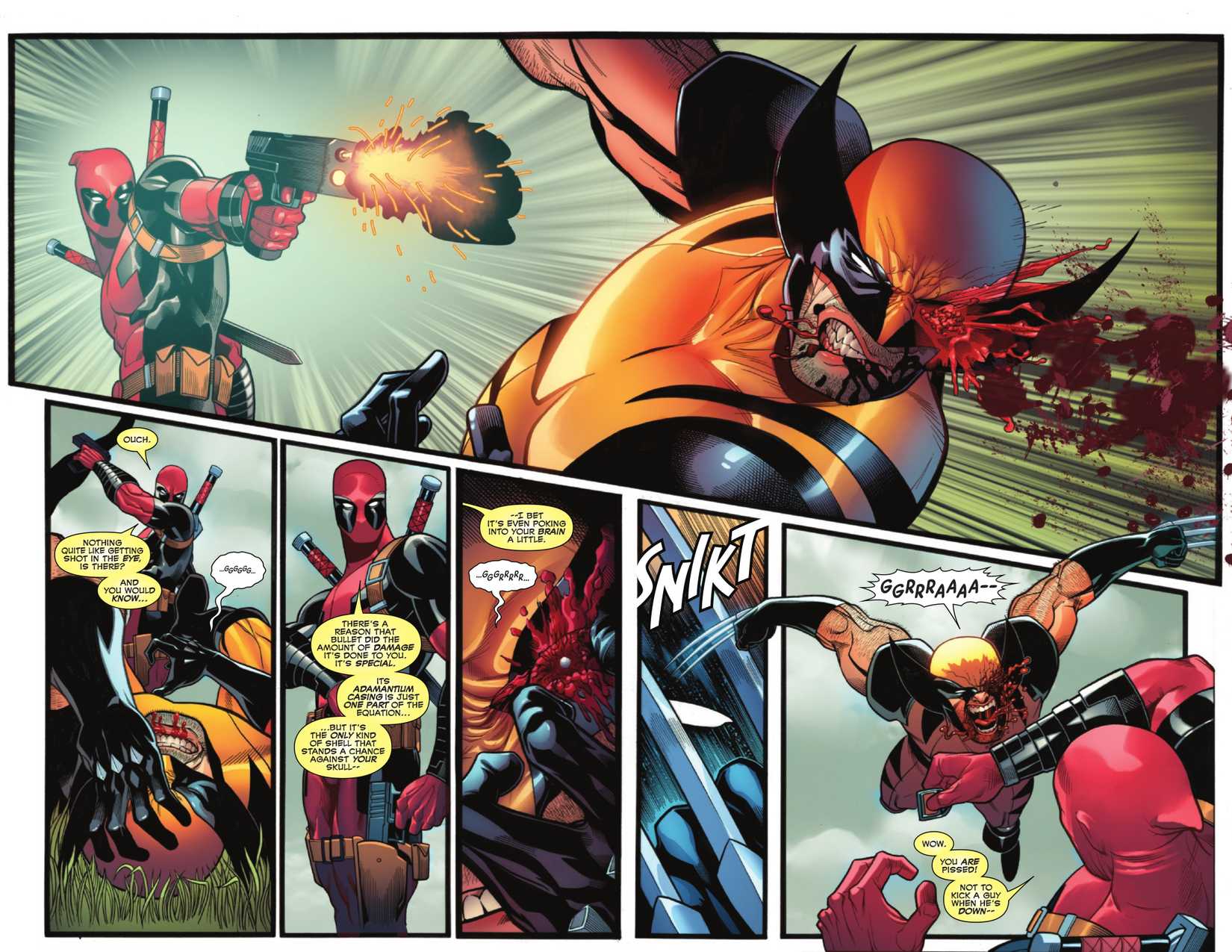 El plan de Deadpool para derribar a Wolverine tiene múltiples etapas, comenzando con Deadpool organizando un ataque secreto contra el X-Man en un ascensor del hotel con una “niebla nano-neutralizador”. Esto pone el factor de curación mutante de Wolverine en el Fritz, lo que permite a Deadpool aprovechar al máximo más adelante. Cuando los dos quedan solos, Deadpool muestra su mano y dispara a Wolverine en el ojo con una bala de camisa de adamantium, explicando que “Es el único tipo de caparazón que tiene una oportunidad contra tu cráneo” Agregar que la bala probablemente está empujando al cerebro de Logan.