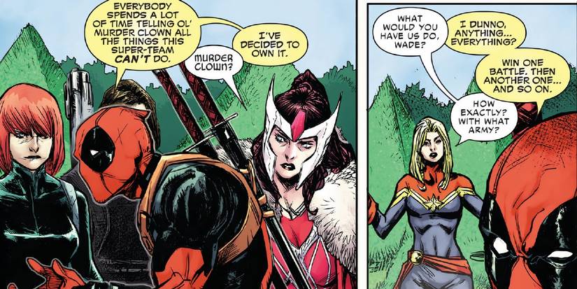 Uniéndose a un poderoso escuadrón de Vengadores formado por la Capitana Marvel, Lady Sif, Venom, Arma H y, finalmente, el Soldado de Invierno, la Viuda Negra y la Capitana Gran Bretaña, Deadpool y los “Vengadores de la Guerra” tuvieron la tarea de mantener la línea mientras la masacre de Guerra de los reinos se enfureció a su alrededorasegurando que el resto de sus heroicos colegas pudieran “abrirse paso” y continuar la lucha. Molesto por su situación y la falta de victorias, Deadpool dice: “Todos pasan mucho tiempo diciéndole a Ol’ Murder Clown todo lo que este súper equipo no puede hacer”, regalándose oficialmente un apodo que también lo destaca como personaje. .